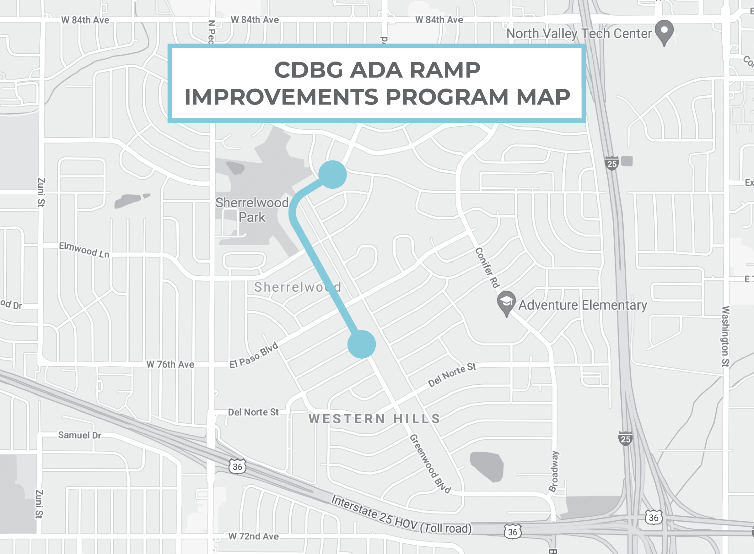 From August–Fall 2021, construction is taking place to improve the County’s ADA Accessibility by removing 21 additional existing non-compliant pedestrian ramps and installing new ADA ramps along the Greenwood Boulevard corridor from Granada Road to 84th Avenue. Adams County awarded the project to a local contractor, WGM Land Design, in March 2021 for $173,823.98. All work is weather-dependent and the schedule is subject to change.
